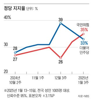 1. **์๊ฐ ์ฒด์ ์ ๊ณ ์ฐฉํ** ๊ตญ๋ฏผ์ํ๊ณผ ๋ฏผ์ฃผ๋น์ ์ด๊ทผ์ ํ ์ง์ง์จ์ ๋ค์ ํ๋ฒ ํ๊ตญ์ ์ ์น ๊ตฌ์กฐ๊ฐ ์๋น ์ฒด์ ๋ก ์๋ฆฌ ์ก๊ณ ์์์ ๋ณด์ฌ์ค๋๋ค. (์ 3, ์ 4์ ์ ๋น์ ์์ฝ๊ฒ๋ ์ฌ์ ํ ๋ฎ์ ์ํฅ๋ ฅ์ ๋ณด์ด๊ณ ์๋ค์.)