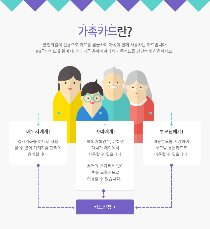 ๊ฐ์กฑ์นด๋๋ ์ฃผํ์(๋ณธ์ธ)์ ์ ์ฉ์ ๊ธฐ๋ฐ์ผ๋ก ๊ฐ์กฑ ๊ตฌ์ฑ์์๊ฒ ์ถ๊ฐ๋ก ๋ฐ๊ธ๋๋ ์ ์ฉ์นด๋๋ฅผ ๋งํฉ๋๋ค. ์ด๋ฅผ ํตํด ์ ์ฉ์นด๋ ๋ฐ๊ธ์ด ์ด๋ ค์ด ์ ์ ์ฃผ๋ถ, ํ์, ์ํดํ์ ๋ถ๋ชจ๋ ๋ฑ๋ ์นด๋๋ฅผ ์ฌ์ฉํ ์ ์๊ฒ ๋ฉ๋๋ค. ๊ฐ์กฑ์นด๋๋ ๊ฐ ๊ฐ์กฑ ๊ตฌ์ฑ์์ ์ด๋ฆ์ผ๋ก ๋ฐ๊ธ๋๋ฉฐ, ์ฌ์ฉํ ๊ธ์ก์ ๋ชจ๋ ์ฃผํ์์ ๊ณ์ข๋ก ์ฒญ๊ตฌ๋ฉ๋๋ค.