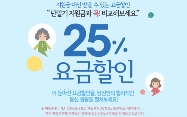 ์ ํ ์ฝ์ ํ ์ธ ์ ๋๋ ์ด๋ํต์ ์๋น์ค์ ๊ฐ์ ํ ๋ ๋จ๋ง๊ธฐ ๊ณต์ ์ง์๊ธ ๋์ ๋งค์ ํต์ ์๊ธ์ 25%๋ฅผ ํ ์ธ๋ฐ์ ์ ์๋ ์ ๋์์. ์ฝ๊ฒ ๋งํด, ํด๋ํฐ์ ์ด ๋ ๋ฐ๋ ํ ์ธ(๋จ๋ง๊ธฐ ์ง์๊ธ)๊ณผ ๋งค๋ฌ ํต์ ๋น๋ฅผ ๋ผ ๋ ๋ฐ๋ ํ ์ธ(์๊ธ ํ ์ธ) ์ค ํ๋๋ฅผ '์ ํ'ํ ์ ์๋ค๋ ๊ฑฐ์ฃ ! ๐ฑ๐ธ